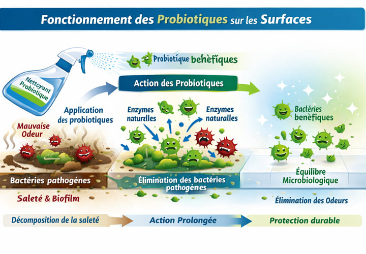 Contrairement aux produits chimiques qui disparaissent après application, les probiotiques continuent à agir longtemps après le nettoyage, grâce à leur capacité à se reproduire et à coloniser les surfaces.